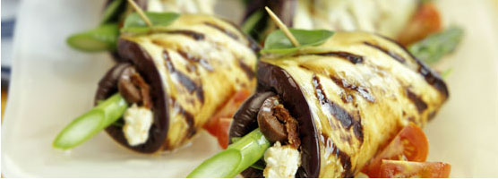 Можно оформить рулетики из баклажанов так как показано на рисунке ниже, вставив в серединку термически обработанный в микроволновке аспарагус и заткнув зубочисткой:
