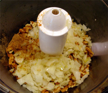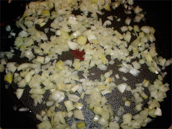 2) Очень мелко нарезанный лук ставим на маленький огонь и пассеруем на подсолнечном масле, пока весь лук не пропитается. Как только замечаем что лук начинает розоветь, снимаем. Ложкой, частями, добавляем его в орехи, попутно тщательно вымешивая смесь.