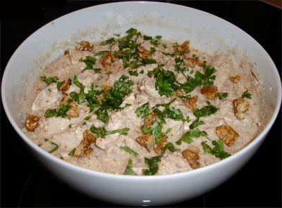 5) Ореховую массу смешиваем со специями, добавляем постный бульон с курицей, ставим на огонь и постоянно помешиваем. Как только закипит, снимаем, охлаждаем и отстаиваем, как было сказано, сутки в холоде. После всех таких манипуляций сациви по-грузински готов к употреблению...