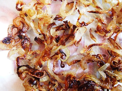Выложите жареный лук на дно салатницы. Сверху полейте