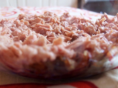 Используя вилку, разомните тунца (или сардины), а затем выложите