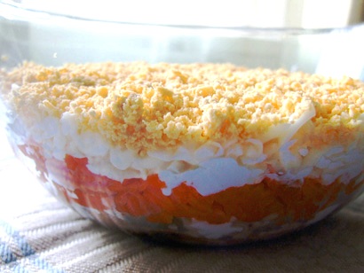 Далее сделайте слой из вареного яичного белка и повторите