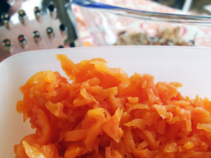 Следующим слоем будет вареная протертая заранее морковь, которую