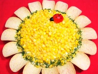 - Если Вам не по вкусу оливки, можно заменить их кукурузой, тогда салат "Подсолнух" с копченой курицей и чипсами будет выглядеть так:
