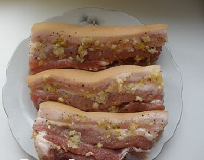 В первую очередь необходимо подготовить наш кусок сала. Для этого его необходимо промыть, обсушить и нарезать полосками приблизительно 4-5 см. Натереть его солью, перцем и другими любимыми специями, чесноком.