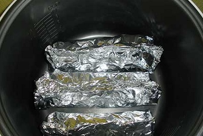 Закладываем наше сало в фольге в мультиварку и выставляем режим «выпечка» на один час. Через час сало можно доставать, охлаждать и подавать к столу.