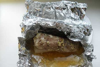 Каждый кусочек сала очень аккуратно завернуть в фольгу. Так как приготовление сала подразумевает, что оно будет готовиться в собственном соку, фольгу стараемся завернуть таким образом, чтоб жидкость не вытекала.