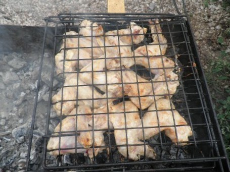 - Через 1,5 часа промариновавшиеся крылышки можно вынуть из соуса и готовить крылышки, нанизав их либо на шампуры, либо выставив их на решетку. Жарить на углях.
