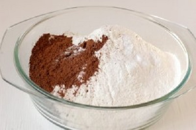В получившуюся массу влить молоко и растительное масло, все хорошо перемешать. Далее добавить муку, разрыхлитель и какао и замесить тесто.