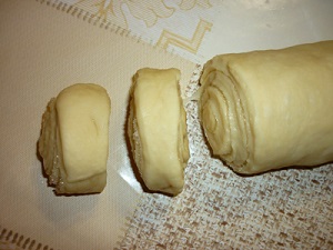 Раскатываем пласт теста, смазываем его растительным или подсолнечным маслом, посыпаем сахаром, корицей или маком по желанию, сворачиваем в рулет и нарезаем на кусочки.