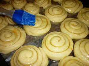Противень смазываем маслом, выкладываем на него булочки, смазываем взбитым желтком и даем подойти еще в течение 15-20 минут.