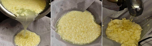 2) Затем слить сыворотку через два слоя марли, а оставшийся сгусток промыть в холодной воде и оставить на 15 минут, чтобы вода полностью стекла: