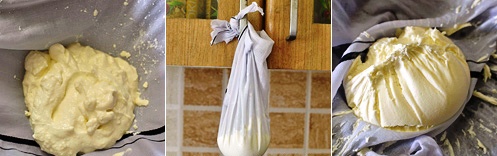 4) Переложите полученную массу опять же на марлю, завяжите концы узелком, подвесьте узелок на дверку кухонного шкафа, подставьте под низ посуду, и оставьте на 5-6 часов в подвешенном состоянии, для того чтобы вся жидкость стекла из сыра. После того как пройдет означенное время, откройте узелок, переложите сыр в контейнер, накройте крышкой и уберите на ночь в холодильник: