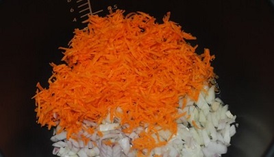 Чашу мультиварки предварительно разогреть установив для этого режимы «жарка» или «выпечка». Мелко порезать лук, выложить его в мультиварку и обжарить до прозрачности.
