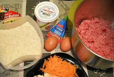 Берем уже готовый фарш, остывший рис, половину предварительно мелко нарезанного лука, два яйца, соль и специи. Смешиваем все ингредиенты максимально тщательно, до получения однородной массы.