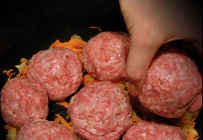 Формируем тефтели среднего размера. Для того, чтоб фарш не приставал к рукам, время от времени смачиваем руки холодной водой из под крана. Получившиеся шарики выкладываем сверху на зажарку.