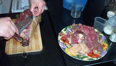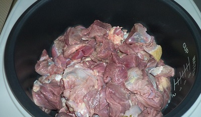 Обрезаем мякоть с костей и режем на небольшие кусочки. Еще раз хорошо промываем и помещаем в чашу мультиварки.