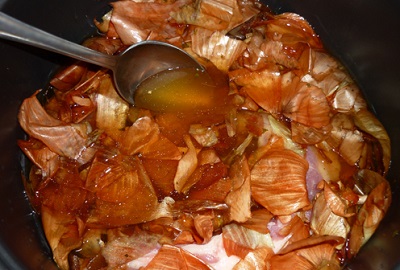 Приготавливаем сало. Если кусок очень длинный можно разрезать его на две одинаковые части. Кипятим литр воды. Луковую шелуху промываем в проточной воде и замачиваем на час. Закладываем в чашу одну горсть шелухи, сверху кладем сало и накрываем его сверху еще одной горстью шелухи. Бросаем лавровый лист.