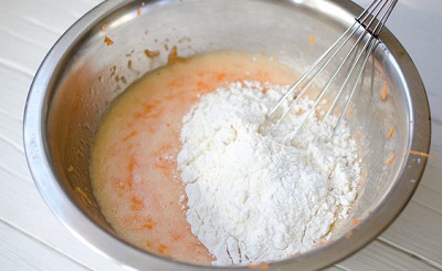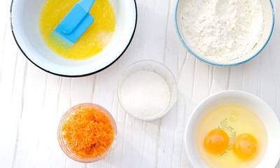 Сливочное масло разогреть на слабом огне и дать ему немного остыть. Морковку натереть на мелкой терке. Можно добавить к моркови немного яблок и меда. 1 стакан муки смешать с разрыхлителем. В миске смешать морковку сахар и яйца, добавить растопленное масло и перемешать при помощи венчика.