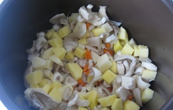 Добавляем нарезанные грибы и картофель, перемешиваем и тушим на этом же режиме еще 15 минут.