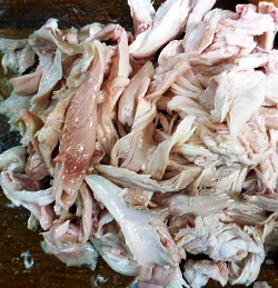 4. После того как мясо будет готово, вынуть его, бульон процедить, мясо разобрать на волокна, косточки выкинуть.