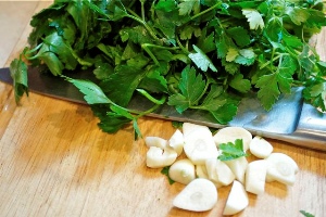 8. Варить 10 минут, затем чеснок порезать как показано на фото, петрушку крупно порезать, отправить все в загустевший бульон, огонь выключить, кастрюлю накрыть крышкой на пять минут.