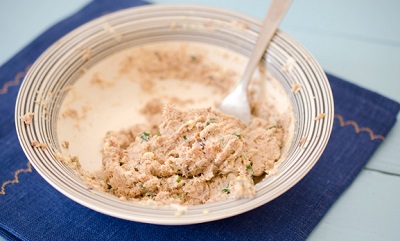 Яйца отварить и разрезать вдоль пополам. Вынимаем желтки и измельчаем лук. Тунец выкладываем из банки в миску. Стараемся не добавлять всю жидкость, и разминаем вилкой.