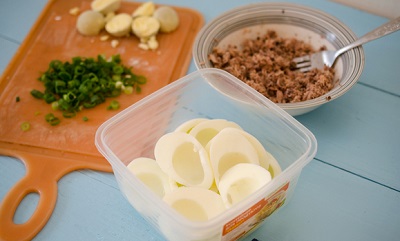 Фаршированные яйца можно назвать одной из самых популярных закусок, которые часто готовят на праздники. Такая закуска представляет собой супер-белковое блюдо, которое вряд ли испортит фигуру. Кроме того оно готовится быстро и просто и придется по вкусу даже самым сильным гурманам. Тунец содержит в себе много белков, жирных кислот и гемоглобина. Для приготовления этого блюда достаточно купить консервированный тунец в собственном соку. Это блюдо можно подавать к столу вместе с бородинским хлебом, испеченным в хлебопечке. Фаршированные яйца и хлеб будут прекрасно дополнять друг друга.