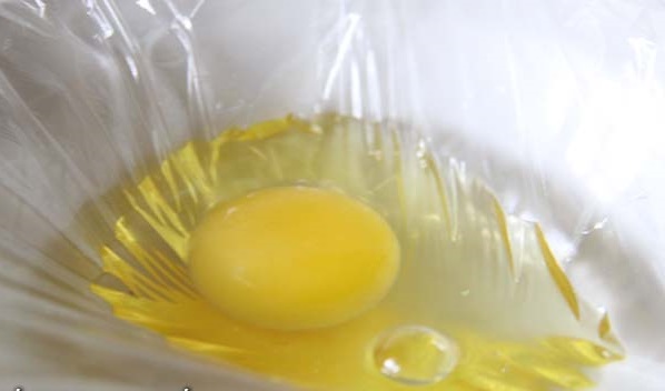 Края пленки завязать узлом или перетянуть при помощи нитки. При этом необходимо позаботиться о том, чтоб внутри пленки оставалось немного свободного пространства. Получившийся пакет, необходимо опустить в не сильно кипящую воду, на три или пять минут. Достать яйцо, отрезать пленку и подать с гренками, колбасой или беконом к столу.