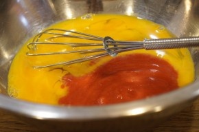 Яйца взбиваем в миску, солим и смешиваем с томатным пюре.