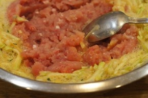 Кабачки чистим от кожуры и хорошо отжимаем. Лук и болгарский перец трем на терке или мелко шинкуем. Смешиваем кабачик, лук, перец и яйца с пюре, добавляем в полученную смесь фарш. Соль и специи добавляем по вкусу.