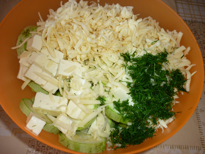 Кабачки моем и режем на небольшие кружочки. Если кабачки молодые, то кожицу с них можно не снимать. Лук чистим и режем кольцами, мелко режем укроп.