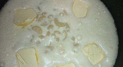 Чашу мультиварки смазываем маслом, выкладываем макароны. Сверху посыпаем натертым на терке сливочным маслом. Готовим в мультиварке на режиме «выпечка» в течении 50 минут.