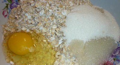 Хорошо вымыть яблоки, очистить от сердцевины и кожуры, нарезать на небольшие кубики и посыпать корицей и сахаром. В отдельной емкости смешать сахар, молоко, яйца и овсяные хлопья.