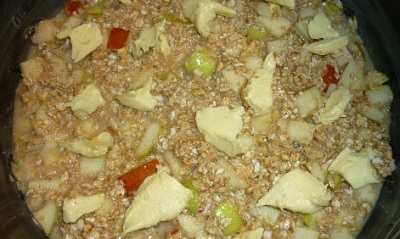 Чашу мультиварки смазать маслом, выложить в нее смесь из яблок и овсяных хлопьев.