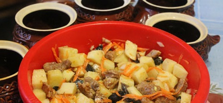 Горшочки ставим в духовку, разогретую до 220 и готовим блюдо в течение часа-полтора. Когда блюдо готово, даем ему 15-20 минут настояться и подаем к столу.