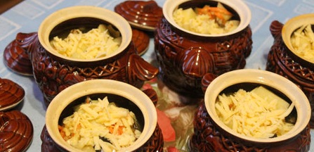 Выложить ингредиенты в глиняные горшочки и залить соусом. Для соуса можно смещать воду с майонезом или сметаной или использовать мясной бульон. Сверху можно положить небольшой кусочек масла и немного тертого сыра.