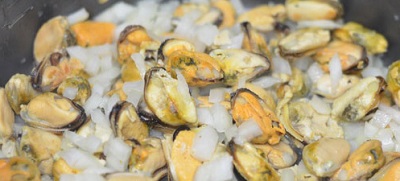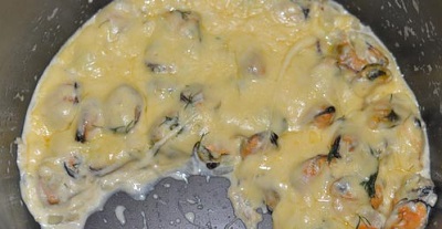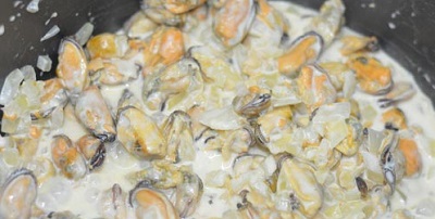Добавляем лук к мидиям и готовим еще 10 минут. Трем сыр на крупной терке. По прошествии 20 минут от начала приготовления добавляем в мидии сливки.