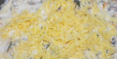 Даем продуктам потомиться еще пару минут, и выкладываем сверху сыр. Готовим еще пару минут на режиме выпечка и выключаем. Аккуратно делим готовый жульен лопаткой на несколько порций и подаем к столу.