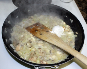 3. Поджаривать в течение примерно 10 минут, пока грибы хорошенько не подрумянятся. Далее добавить подготовленную муку. Перемешать все вместе.