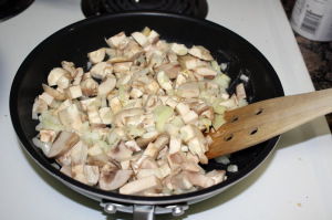 - В сковороде на среднем огне растопите 2 столовые ложки сливочного масла. Нашинкуйте мелко лук и пассеруйте в течение 5 минут. Далее нарезаем грибы и тоже отправляем в сковороду.
